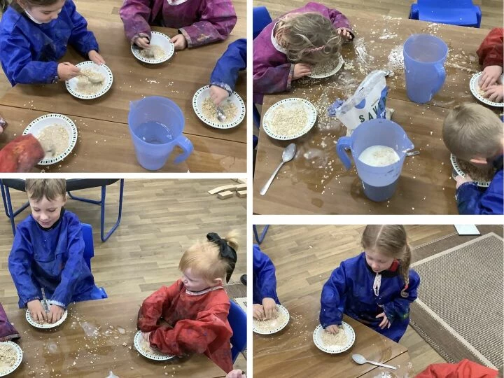 We've had an enchanted week in Base 1 so far! Our Drawing Club story has been 'The Magic Porridge Pot', and the children have absolutely loved getting messy with gloopy, endless porridge. We began by exploring what happens to porridge oats when we add different amounts of water, then investigated a variety of ways to make porridge before having a go at ordering the instructions ourselves. Today, we brought the learning to life by making our very own porridge – and the children had so much fun! Along the way, we've learned lots of exciting new vocabulary such as gloopy, endless, cease, enchanted, and more. Ask your child to share some of the fantastic new words they've learned this week – they even know the actions to match!