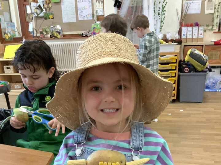 We then had a wonderful time exploring Mrs Charlesworth's brother's tractor, making our own Mr Potato heads, watering our beans and exploring different vegetables!