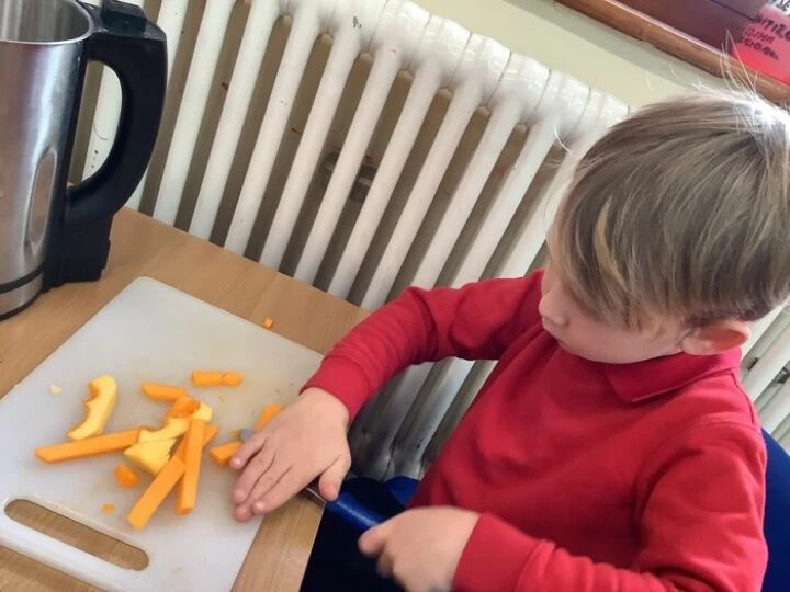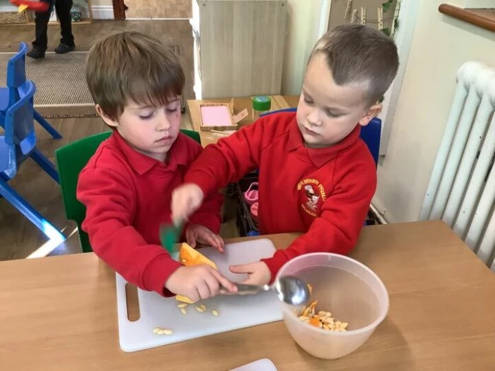 We have had a wonderful day today making pumpkin soup. We scooped the seeds out of the vegetables, chopped them up and used Mrs Evans' soup maker to make it into soup!